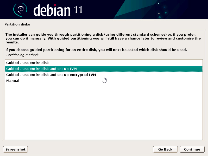 - Select “Guided – user entire disk and set up LVM”