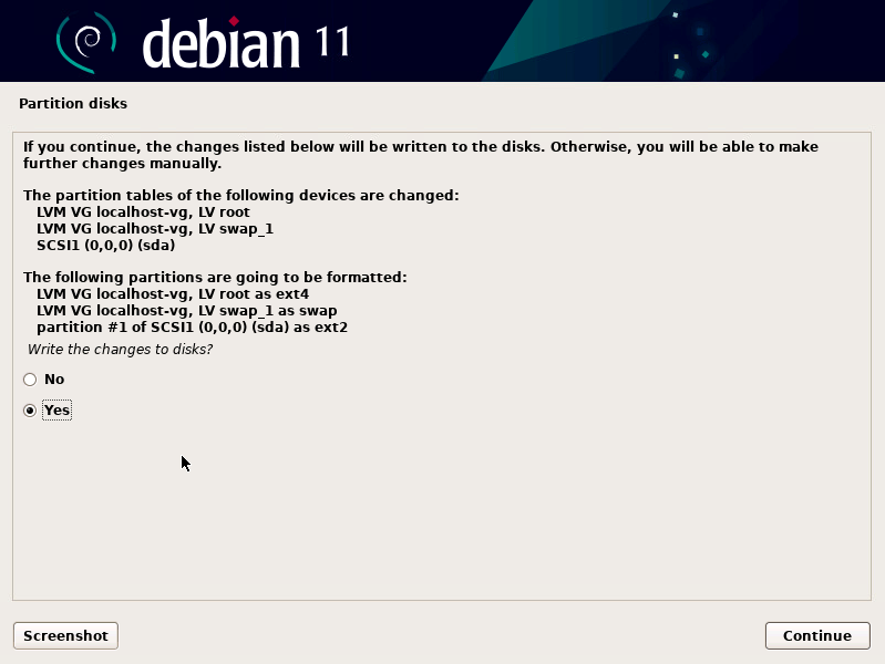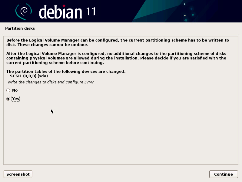 - Select “Yes” under “Write the changes to disks and configure LVM”