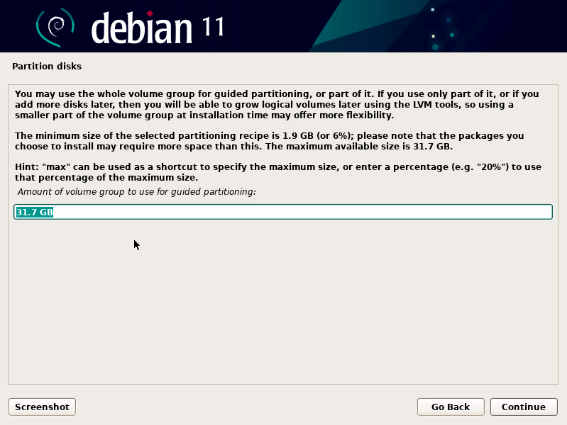 - Accept the default size (should be the entire drive) or enter “max”
