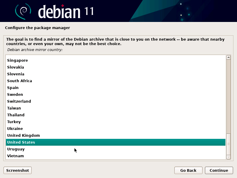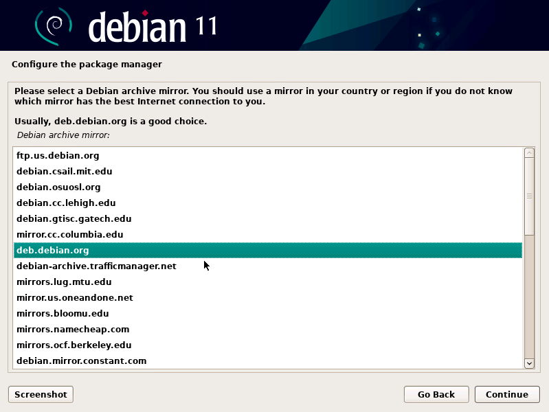 - Select default mirror (or mirror of your choice)