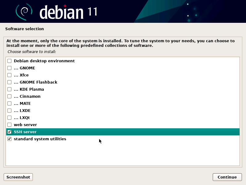 - Select: SSH server (standard system utilities should be selected by default)