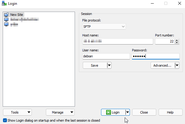 Open your SCP client (I am using WinSCP) and enter the following: