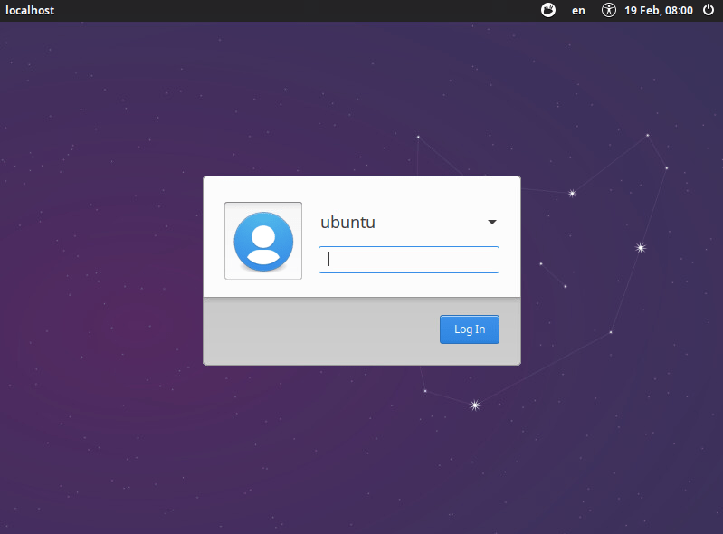 After a few moments the system will start up and prompt you for a username and password – use the credentials we set up during install (user: ubuntu / pass: ubuntu)*