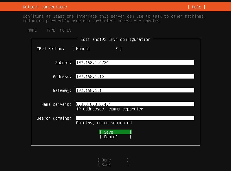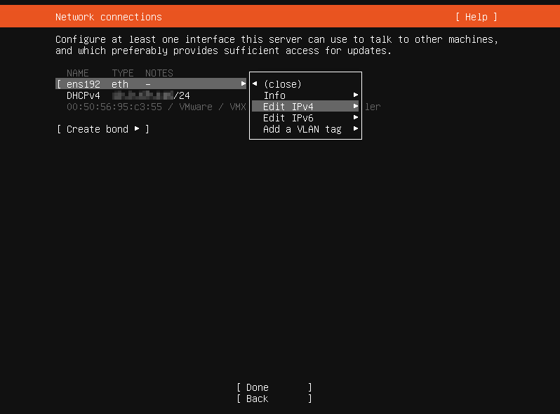 - Select “ens192” -> Edit IPv4 and change dropdown to “Manual”