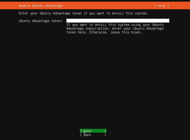 - Select “Done” to skip adding an Ubuntu Advantage token (unless you have one)